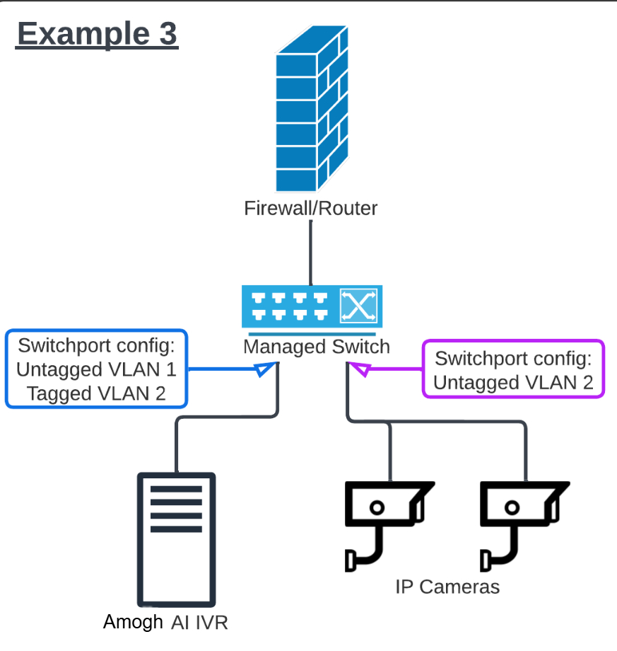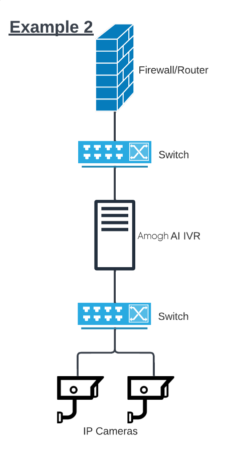 The Amogh AI appliance needs access to both the internet and your camera network in order to function. Below are a few examples of the most common network topologies. Note that each black line in the diagrams represents an ethernet connection. They are ranked based on their complexity from low to high.